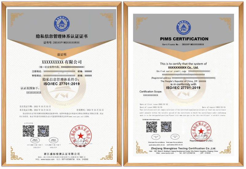 ISO/IEC 27701:2019 隱私信息管理體系認證證書(shū)樣本: