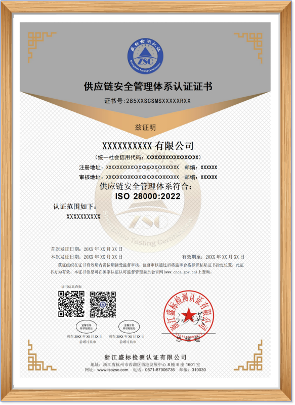 ISO 28000:2022 供應鏈安全管理體系認證證書(shū)樣本:
