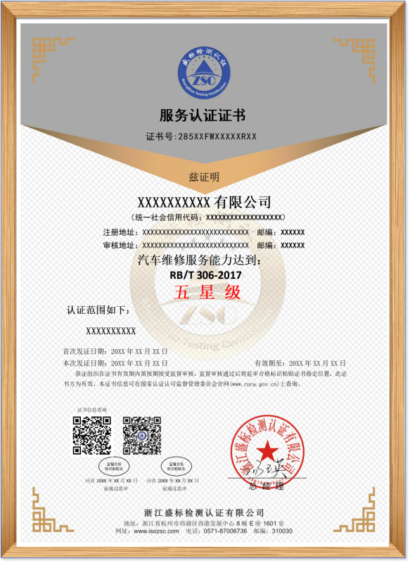 RB/T 306-2017 汽車(chē)維修服務(wù)認證證書(shū)樣本: