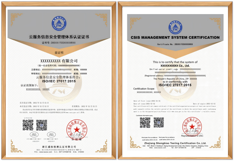 ISO/IEC 27017:2015 云服務(wù)信息安全管理體系認證證書(shū)樣本: