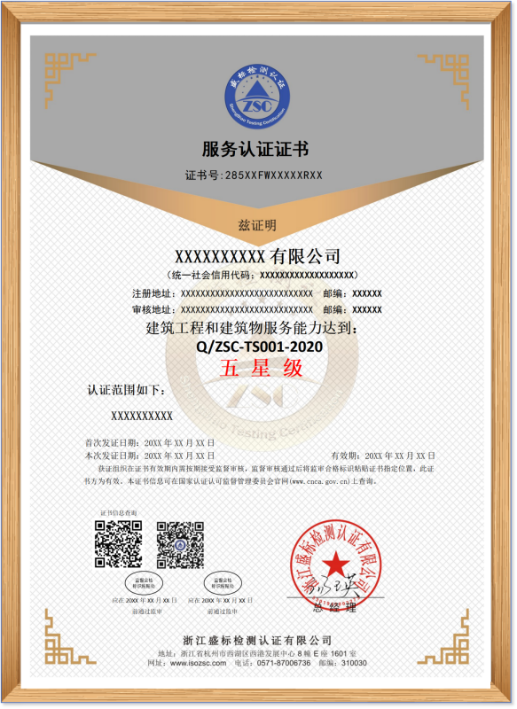Q/ZSC-TS001-2020 建筑工程和建筑物服務(wù)認證證書(shū)樣本: