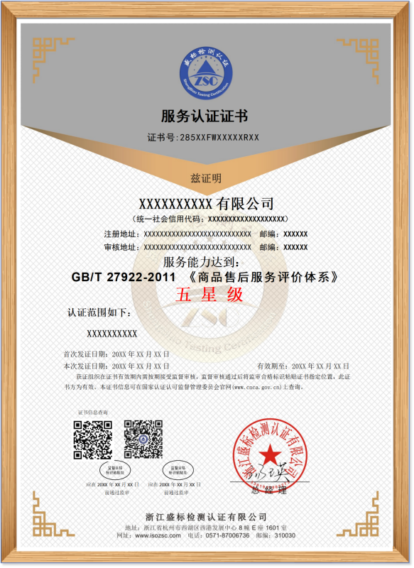 GB/T 27922-2011 商品售后服務(wù)評價(jià)體系認證證書(shū)樣本: