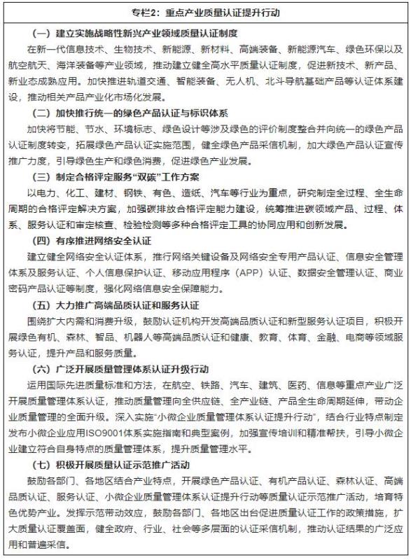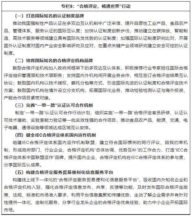貫徹創(chuàng )新、協(xié)調、綠色、開(kāi)放、共享的新發(fā)展理念,深入推進(jìn)質(zhì)量強國建設,大力開(kāi)展質(zhì)量提升行動(dòng),全面提升認證認可檢驗檢測服務(wù)供給水平,推動(dòng)質(zhì)量變革、動(dòng)力變革、效率變革,促進(jìn)質(zhì)量提升和產(chǎn)業(yè)升級,助推經(jīng)濟社會(huì )高質(zhì)量發(fā)展。1.服務(wù)制造強國、質(zhì)量強國建設(1)促進(jìn)產(chǎn)業(yè)基礎能力提升。圍繞推進(jìn)工業(yè)強基,強化基礎原材料、基礎零部件、基礎工藝、基礎設施的認證認可檢驗檢測支撐能力,支撐實(shí)施產(chǎn)業(yè)基礎再造工程。推進(jìn)鋼鐵、有色、石化、輕工、紡織、建材等基礎原材料產(chǎn)業(yè)領(lǐng)域的檢驗檢測認證能力提升,支持科研院所、骨干企業(yè)、從業(yè)機構組建檢驗檢測認證創(chuàng )新聯(lián)盟,加強重點(diǎn)基礎材料和新材料檢驗檢測技術(shù)攻關(guān),建立具有較高行業(yè)影響力的認證制度,促進(jìn)基礎原材料產(chǎn)業(yè)結構調整升級;完善基礎零部件產(chǎn)品認證制度,強化認證一致性保障能力,提升電子元器件認證的國際互認度,推動(dòng)北斗基礎產(chǎn)品認證的拓展應用,促進(jìn)基礎零部件、元器件質(zhì)量提升;圍繞基礎工藝改造升級,協(xié)同推動(dòng)相關(guān)產(chǎn)業(yè)領(lǐng)域合格評定方案優(yōu)化完善,提升企業(yè)質(zhì)量診斷、改進(jìn)、驗證等能力;建立健全物聯(lián)網(wǎng)、工業(yè)互聯(lián)網(wǎng)、車(chē)聯(lián)網(wǎng)等領(lǐng)域認證制度和檢驗檢測體系,強化新一代信息基礎設施建設的支撐保障能力。(2)推動(dòng)產(chǎn)業(yè)鏈供應鏈現代化。健全覆蓋產(chǎn)業(yè)鏈供應鏈全過(guò)程的質(zhì)量認證和檢驗檢測體系,促進(jìn)產(chǎn)業(yè)鏈供應鏈安全暢通和優(yōu)化升級。運用國際先進(jìn)質(zhì)量標準和方法,在航空、鐵路、城市軌道交通、汽車(chē)、建筑、醫藥、信息、環(huán)保等重點(diǎn)產(chǎn)業(yè),探索建立適合行業(yè)特點(diǎn)的質(zhì)量認證制度,推動(dòng)質(zhì)量管理向全供應鏈、全產(chǎn)業(yè)鏈、產(chǎn)品全生命周期延伸;推行供應鏈安全管理體系、業(yè)務(wù)連續性管理體系、合規管理體系等新型管理體系認證,提升供應鏈管理水平;優(yōu)化檢驗檢測認證服務(wù)模式和產(chǎn)業(yè)布局,為產(chǎn)業(yè)鏈供應鏈上下游提供一體化服務(wù),鼓勵產(chǎn)業(yè)鏈供應鏈頭部企業(yè)、集群企業(yè)引導采信,降低市場(chǎng)采購成本,提升產(chǎn)業(yè)鏈供應鏈運行效率。(3)支撐制造業(yè)優(yōu)化升級。實(shí)施“重點(diǎn)產(chǎn)業(yè)質(zhì)量認證提升行動(dòng)”,深入開(kāi)展“質(zhì)量管理體系認證升級活動(dòng)”,引導各類(lèi)企業(yè)提升質(zhì)量管理水平,鼓勵認證機構研發(fā)高于行業(yè)通用標準的高端品質(zhì)認證,大力開(kāi)展軌道交通、智能裝備、無(wú)人機、機器人、智能家電、車(chē)聯(lián)網(wǎng)產(chǎn)品等認證,探索開(kāi)展新型儲能、物聯(lián)網(wǎng)、區塊鏈、隱私計算等認證,助推制造業(yè)提質(zhì)升級。實(shí)施“檢驗檢測助推產(chǎn)業(yè)升級行動(dòng)”,提升重點(diǎn)行業(yè)檢驗檢測技術(shù)支撐能力,依托戰略性新興產(chǎn)業(yè)、制造業(yè)產(chǎn)業(yè)集群布局建設專(zhuān)業(yè)化檢驗檢測平臺,突破一批基礎性、公益性和產(chǎn)業(yè)共性技術(shù)瓶頸,支撐企業(yè)創(chuàng )新發(fā)展和產(chǎn)業(yè)轉型升級。(4)助力服務(wù)業(yè)高質(zhì)量發(fā)展。加快構建服務(wù)業(yè)認證認可體系,開(kāi)展服務(wù)認證示范活動(dòng),促進(jìn)服務(wù)業(yè)標準化、品牌化建設,提高服務(wù)品質(zhì)和服務(wù)效率。在生產(chǎn)性服務(wù)業(yè)領(lǐng)域,積極推動(dòng)工程建設、數字設計、物流運輸、節能環(huán)保服務(wù)、綠色數據中心等服務(wù)認證,加強重大交通基礎設施、城市軌道交通運行維護、郵政快遞包裝、智能化物流裝備等檢驗檢測能力建設,促進(jìn)服務(wù)型制造等新業(yè)態(tài)發(fā)展,推動(dòng)生產(chǎn)性服務(wù)業(yè)向專(zhuān)業(yè)化和價(jià)值鏈高端延伸;在生活性服務(wù)業(yè)領(lǐng)域,廣泛開(kāi)展健康、教育、體育、養老、金融、商品售后、電子商務(wù)等服務(wù)認證,提升生活服務(wù)品質(zhì),推動(dòng)生活性服務(wù)業(yè)向高品質(zhì)和多樣化升級。2.暢通國內國際雙循環(huán)(1)促進(jìn)全國統一大市場(chǎng)建設。圍繞建設高效規范、公平競爭、充分開(kāi)放的全國統一大市場(chǎng),加快構建統一管理、共同實(shí)施、權威公信、通用互認的認證認可檢驗檢測體系,完善市場(chǎng)信用機制,推動(dòng)消除區域性市場(chǎng)壁壘,促進(jìn)要素資源市場(chǎng)化配置。貫徹落實(shí)黨中央、國務(wù)院關(guān)于汽車(chē)、電子電器等行業(yè)市場(chǎng)準入和流通管理全流程改革的決策部署,推進(jìn)行業(yè)準入制度改革,取消重復評價(jià)項目,降低市場(chǎng)交易成本;清理涉及認證認可檢驗檢測的行政許可和行業(yè)評價(jià)制度,推動(dòng)面向社會(huì )的第三方技術(shù)評價(jià)活動(dòng)遵循通用準則和標準,逐步向國家統一的認證制度轉變,在已建立國家統一認證制度