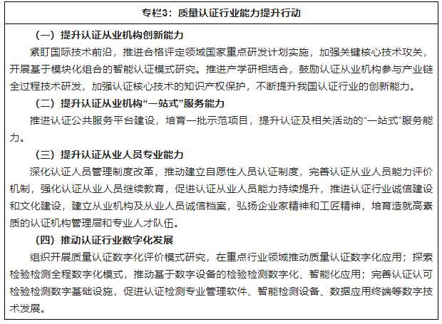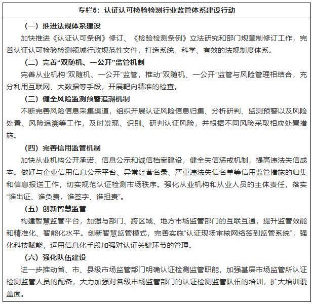 以改革創(chuàng )新為動(dòng)力,以提升供給質(zhì)量為主線(xiàn),扎實(shí)推進(jìn)法治、制度、科技、人才隊伍建設,全面強化基礎支撐能力,推動(dòng)認證認可檢驗檢測高質(zhì)量發(fā)展。1.強化法紀保障(1)完善法律法規體系。加快修訂《認證認可條例》,研究起草《檢驗檢測條例》,推動(dòng)相關(guān)法律法規完善涉及認證認可檢驗檢測的條款,加快合格評定立法進(jìn)程。加強認證認可檢驗檢測領(lǐng)域部門(mén)規章、規范性文件制修訂工作,完善從業(yè)機構資質(zhì)、從業(yè)人員管理、合格評定活動(dòng)及監督管理等規章制度;全面落實(shí)合法性審核、公平競爭審查等要求,提升立法質(zhì)量。(2)科學(xué)界定權責事項。全面推行清單管理,建立認證認可檢驗檢測監管領(lǐng)域的權力清單、責任清單和市場(chǎng)準入負面清單,有效規范行政執法行為和市場(chǎng)主體行為;堅持“誰(shuí)審批、誰(shuí)監管、誰(shuí)主管、誰(shuí)監管”原則,厘清行業(yè)管理職責邊界;堅持屬地管理和分級管理相結合,合理劃分各層級認證認可檢驗檢測監管權責事項。(3)完善監督制約機制。嚴格規范認證認可檢驗檢測領(lǐng)域公權力的運用,健全權力運行監督制約機制,切實(shí)加強行風(fēng)廉政建設,強化行紀銜接和行刑銜接,加大監督力度,落實(shí)監督責任,堅決維護認證認可檢驗檢測工作的公正性、廉潔性和有效性。2.強化技術(shù)支撐(1)優(yōu)化合格評定標準供給。完善合格評定標準化工作機制,發(fā)揮全國認證認可標準化技術(shù)委員會(huì )(TC261)的歸口管理職能,加快推動(dòng)合格評定國際標準的轉化應用,規范引導合格評定領(lǐng)域國家標準、行業(yè)標準、團體標準的協(xié)調發(fā)展,形成更為科學(xué)合理的合格評定標準體系。積極促進(jìn)合格評定領(lǐng)域應用先進(jìn)標準和最新科技成果,開(kāi)展行業(yè)標準自查清理工作,積極采用行業(yè)先進(jìn)標準,鼓勵行業(yè)協(xié)會(huì )、產(chǎn)業(yè)技術(shù)聯(lián)盟研制滿(mǎn)足合格評定需求的團體標準,全面提升合格評定標準供給水平。(2)提升合格評定創(chuàng )新能力。加強政策理論研究,完善合格評定體系頂層設計,為認證認可檢驗檢測創(chuàng )新發(fā)展提供政策指導和智力支持;健全產(chǎn)學(xué)研用一體化機制,鼓勵從業(yè)機構研制高于行業(yè)通用要求的合格評定技術(shù)方案,鼓勵企業(yè)、科研院所、行業(yè)協(xié)會(huì )參與合格評定創(chuàng )新研發(fā)活動(dòng),健全“認證制度所有者”機制,加強對自主創(chuàng )新技術(shù)成果的保護應用;開(kāi)展關(guān)鍵核心技術(shù)攻關(guān),適應合格評定技術(shù)正在由小樣本抽樣向大數據分析、由單一屬性向多屬性系統評價(jià)、由定性評價(jià)向定量化評價(jià)、由傳統技術(shù)向智慧化、全生命周期技術(shù)發(fā)展的趨勢,開(kāi)展合格評定數字化、智慧化、精量化、系統化技術(shù)研究,全面提升合格評定技術(shù)支撐引領(lǐng)能力。(3)推動(dòng)檢驗檢測資源高水平利用。推動(dòng)檢驗檢測儀器設備高端化發(fā)展,引導資源、經(jīng)費向檢驗檢測儀器設備研制傾斜,加強數字化、智能化檢測技術(shù)裝備研發(fā)應用,建立國產(chǎn)檢驗檢測儀器設備驗證評價(jià)體系,開(kāi)展國內外高端儀器儀表性能對比、驗證和綜合評價(jià),提升檢驗檢測儀器設備的技術(shù)水平;加強檢驗檢測標準樣品/標準物質(zhì)的研制,深化檢驗檢測方法規程、儀器設備、實(shí)驗環(huán)境、商標標識等方面的創(chuàng )新研發(fā)和知識產(chǎn)權保護,提升檢驗檢測要素資源的綜合應用水平;構建檢驗檢測資源開(kāi)放共享平臺,提高資源開(kāi)發(fā)利用效率。3.強化人才引領(lǐng)(1)打造教育培訓基地。加強認證認可檢驗檢測學(xué)科教育建設,支持高等院校、職業(yè)技術(shù)學(xué)校、教育培訓機構與認證認可檢驗檢測機構加強合作,打造教育培訓示范基地,開(kāi)發(fā)適應產(chǎn)業(yè)和社會(huì )需求的合格評定教育培訓課程,面向行業(yè)、政府、社會(huì )提供多層次、多領(lǐng)域、多渠道專(zhuān)業(yè)培訓。(2)提升專(zhuān)業(yè)隊伍能力。建立健全質(zhì)量認證和檢驗檢測從業(yè)人員職業(yè)資格制度,完善能力評價(jià)和繼續教育機制,持續提升人員能力素質(zhì)。加強對認證從業(yè)人員注冊考試的管理,組織開(kāi)展認證人員研修活動(dòng),壯大認證審核人員隊伍,加強檢驗檢測機構評審員培訓和監督管理,優(yōu)化評審員選派和現場(chǎng)評審機制,推進(jìn)行業(yè)評審組建設,提高評審員隊伍職業(yè)道德和專(zhuān)業(yè)能力素養。大力弘揚企業(yè)家精神和工匠精神,讓追求卓越、崇尚質(zhì)量成為行業(yè)的價(jià)值導向,造就高素質(zhì)的檢驗檢測認證機構管理層和行業(yè)領(lǐng)軍隊伍。(3)加強監管隊伍建設。加強各級市場(chǎng)監管部門(mén)的認證認可檢驗檢測監管能力建設,明確監管職能權責,充實(shí)監管資源配備,配齊監管人員隊伍,加強對基層一線(xiàn)的傾斜支持,建設一支政治過(guò)硬、業(yè)務(wù)精湛、作風(fēng)優(yōu)良的認證認可檢驗檢測監管隊伍。加強培訓指導力度,豐富完善培訓教材和監管執法案例庫,開(kāi)展多層次的培訓交流、