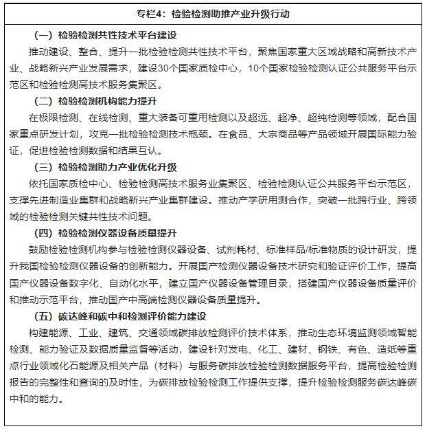 (1)促進(jìn)質(zhì)量認證和檢驗檢測一體化發(fā)展。鼓勵從業(yè)機構通過(guò)業(yè)務(wù)合作、資產(chǎn)重組和收購兼并等手段,拓展檢驗檢測認證業(yè)務(wù)領(lǐng)域,彌補資質(zhì)能力短板,延伸合格評定服務(wù)鏈,形成復合型、一體化的合格評定能力;鼓勵從業(yè)機構針對用戶(hù)需求,研發(fā)一體化合格評定解決方案,提升綜合服務(wù)能力;鼓勵認證機構在具備相應能力的前提下,拓展關(guān)聯(lián)性強的產(chǎn)品、體系、服務(wù)等多元化認證業(yè)務(wù);鼓勵專(zhuān)業(yè)能力強、市場(chǎng)信譽(yù)好的檢驗檢測機構,申請取得相同領(lǐng)域的認證資質(zhì);鼓勵檢驗檢測認證公共服務(wù)平臺和檢驗檢測認證聯(lián)盟發(fā)揮整合功能,優(yōu)化資源配置,開(kāi)展協(xié)同服務(wù)。(2)提升檢驗檢測認證機構專(zhuān)業(yè)能力和品牌形象。強化政策激勵引導,推動(dòng)符合條件的檢驗檢測認證機構獲得高新技術(shù)企業(yè)認定,完善檢驗檢測認證行業(yè)品牌培育、發(fā)展、激勵、保護政策和機制,營(yíng)造良好的品牌成長(cháng)環(huán)境,提升檢驗檢測認證行業(yè)的品牌形象;鼓勵檢驗檢測認證機構通過(guò)認可機構的認可,提升專(zhuān)業(yè)能力,增進(jìn)各方信任;支持大型機構發(fā)展綜合型一體化服務(wù),實(shí)施行業(yè)“領(lǐng)跑者”計劃,培育一批行業(yè)頭部企業(yè),打造國際知名品牌;支持中小型機構走“專(zhuān)精特新”發(fā)展道路,培育一批“單項冠軍”“隱形冠軍”,提升專(zhuān)業(yè)化服務(wù)能力,形成特色品牌優(yōu)勢。(3)優(yōu)化國家質(zhì)檢中心布局。加強對國家質(zhì)檢中心的規劃、建設和管理,完善退出機制,優(yōu)先支持建設一批服務(wù)高新技術(shù)產(chǎn)業(yè)、戰略性新興產(chǎn)業(yè)發(fā)展的國家質(zhì)檢中心;支持國家質(zhì)檢中心參與國家重點(diǎn)實(shí)驗室、國家制造業(yè)創(chuàng )新中心、國家產(chǎn)業(yè)技術(shù)創(chuàng )新中心和國家技術(shù)創(chuàng )新中心等建設,承擔首臺套重大技術(shù)裝備檢測評定、儀器設備研制、能力驗證牽頭組織等工作,充分發(fā)揮國家質(zhì)檢中心的技術(shù)引領(lǐng)支撐作用。(4)推動(dòng)國家質(zhì)量基礎設施融合發(fā)展。構建統籌協(xié)調、協(xié)同高效、系統完備的國家質(zhì)量基礎設施融合發(fā)展體系,推動(dòng)認證認可檢驗檢測與計量、標準(含標準樣品)、質(zhì)量管理等要素協(xié)調互動(dòng)、協(xié)同創(chuàng )新、融合發(fā)展,積極開(kāi)展質(zhì)量基礎設施集成服務(wù)基地建設,支持質(zhì)量基礎設施服務(wù)平臺及機構提供合格評定服務(wù),強化認可在質(zhì)量基礎設施體系中的權威評價(jià)作用,強化質(zhì)量認證、檢驗檢測推動(dòng)其他質(zhì)量基礎設施要素廣泛應用和持續改進(jìn)的積極作用,促進(jìn)國家質(zhì)量基礎設施互聯(lián)互通和高質(zhì)量發(fā)展。3.推動(dòng)合格評定數字化發(fā)展(1)創(chuàng )新數字化評價(jià)模式。組織開(kāi)展合格評定數字化評價(jià)模式研究及應用,運用大數據、區塊鏈、人工智能等現代信息技術(shù),推動(dòng)合格評定數字化應用。開(kāi)展基于工業(yè)互聯(lián)網(wǎng)和智能制造的數字化認證模式及其關(guān)鍵技術(shù)的研究與應用,建立健全質(zhì)量認證領(lǐng)域數字化評價(jià)規則和技術(shù)規范,逐步推廣數字證書(shū);探索檢驗檢測全程數字化模式,推動(dòng)基于數字設備的檢驗檢測數字化、智能化應用;推動(dòng)合格評定數字化評價(jià)向產(chǎn)業(yè)鏈供應鏈全過(guò)程、產(chǎn)品全生命周期延伸,提升數字化評價(jià)能力。(2)推動(dòng)行業(yè)數字化發(fā)展。適應產(chǎn)業(yè)數字化發(fā)展要求,推動(dòng)認證認可檢驗檢測行業(yè)數字化管理,完善認證認可檢驗檢測數字基礎設施,促進(jìn)認證檢測專(zhuān)業(yè)管理軟件、智能檢測設備、數據應用終端等數字技術(shù)發(fā)展,通過(guò)數字科技賦能,全面提升行業(yè)管理水平和發(fā)展質(zhì)量效益。