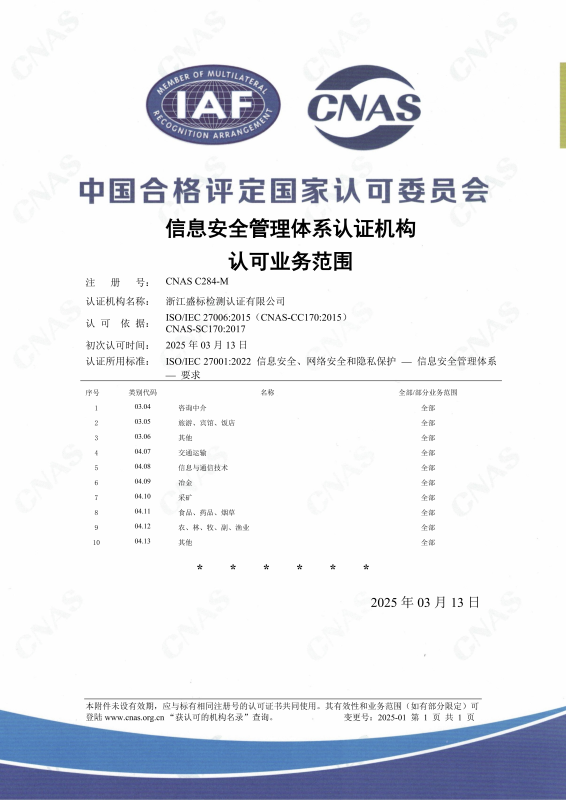 2025年3月27日,浙江盛標檢測認證有限公司再獲喜訊:ISO27001信息安全管理體系和ISO/IEC 20000-1信息技術(shù)服務(wù)管理體系順利通過(guò)中國合格評定國家認可委員會(huì )(CNAS)認可,獲得了雙信息管理體系的認可資格。自從2012年《國務(wù)院關(guān)于大力推進(jìn)信息化發(fā)展和切實(shí)保障信息安全的若干意見(jiàn)》發(fā)布以來(lái),我國大力推進(jìn)信息化發(fā)展,著(zhù)重強調切實(shí)保障信息安全和信息技術(shù)服務(wù)的重要性,全面推進(jìn)信息安全管理體系和信息技術(shù)服務(wù)管理體系的建設,我們盛標認證全體員工亦將為之努力。